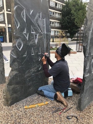 Her recent projects include the Haggerston Stones in Hackney, and carving with sculptor Nina Bilbey on statues of the Queen and Duke of Edinburgh for Canterbury Cathedral.