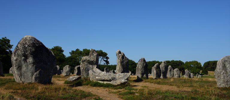 Menhirs can be situated as just one standing stone, or they can be placed as a circle, line, or group. Although researchers generally assume that the menhirs were erected to commemorate something, or for some kind of practical (perhaps ceremonial) uses, we don’t know for sure because Neolithic peoples did not have writing and left no clear evidence. The three best-known sites for standing stones are the Carnac stones in Brittany, the Avebury stone circle, and the giant Stonehenge. But there are others, for example the